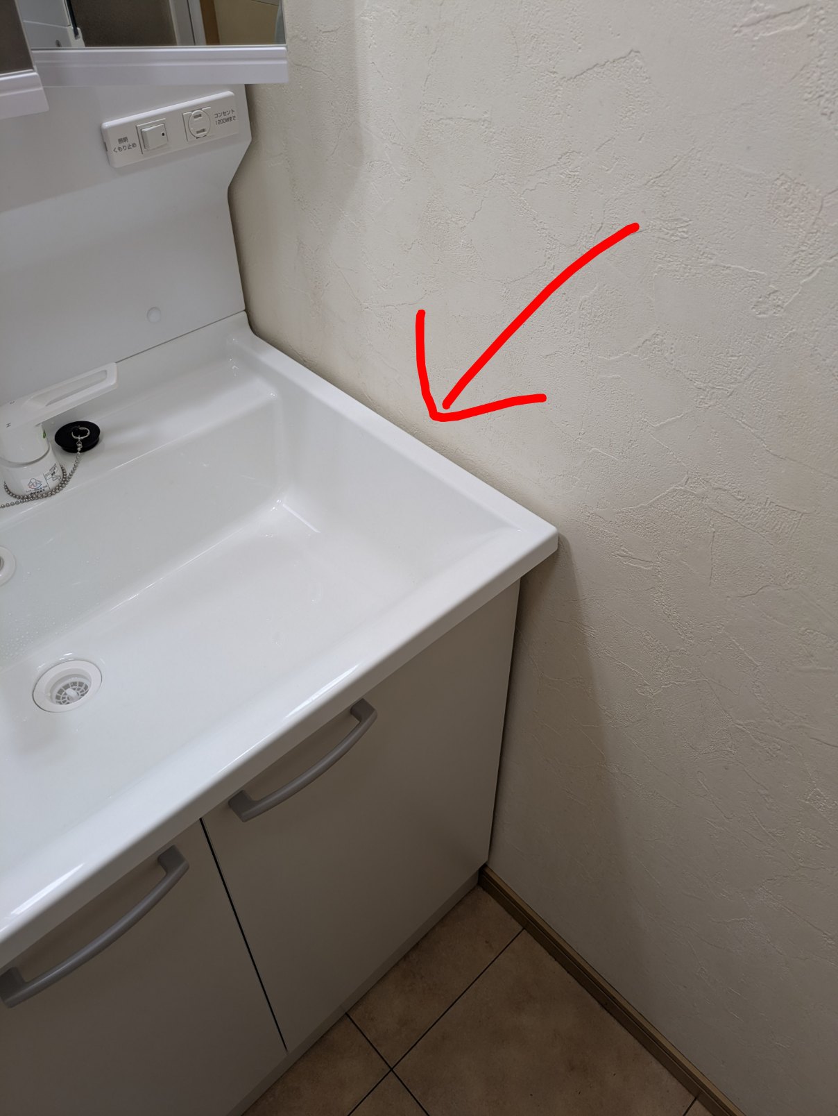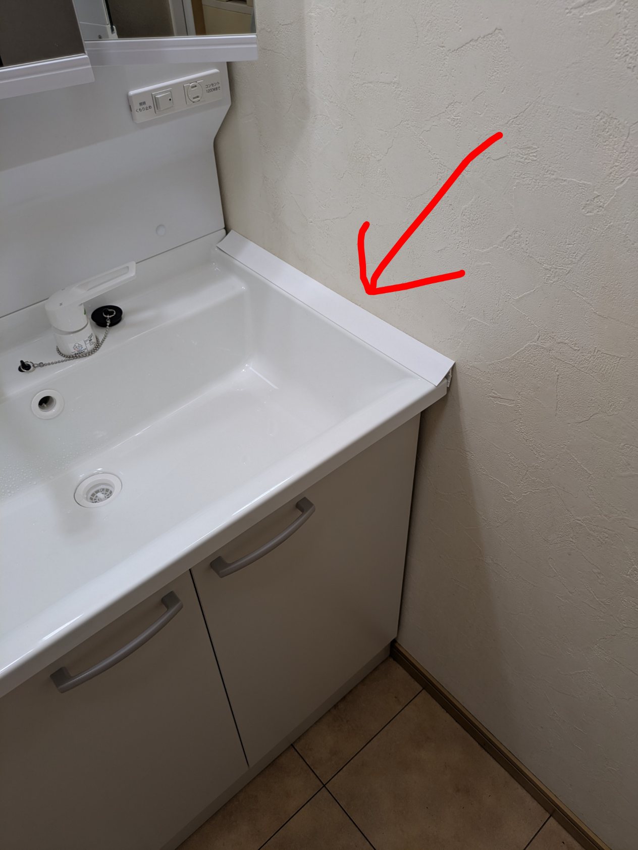 壁と床の間に木巾木があるため右側に1cmほどの隙間が開いてしまったので、
